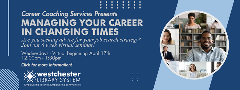 Career Coaching Services Presents Managing Your Career in Changing Times. Are you seeking advice for your job search strategy? Join our 6 week virtual seminar! Tuesdays, Virtually, beginning February twenty seventh.. Ten thirty a m until noon. Click for more information!